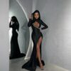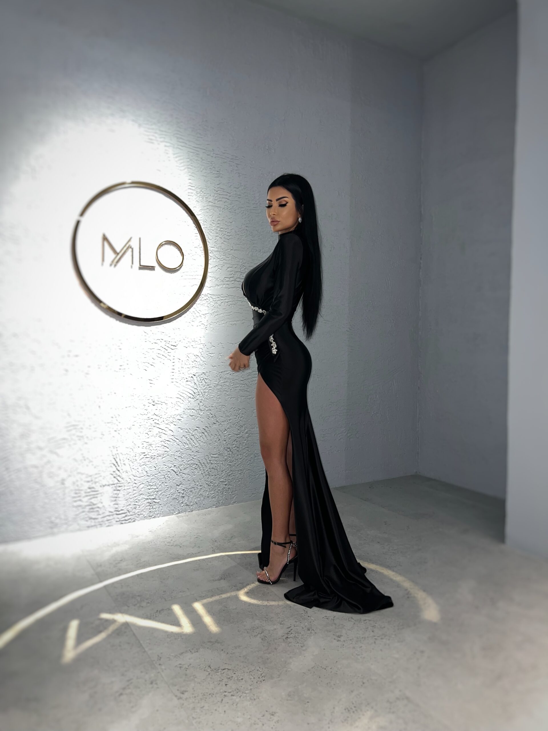 Pășește într-o lume plină de eleganță și rafinament cu ultima noastră colecție; o rochie de seară neagră cu o croială ce îți accentuează perfect linia corpului. Cristalele dispuse în jurul decupajelor captează lumina cu o strălucire radiantă, aspect ce îți pune în valoare senzualitatea stilului tău unic și sofisticat. O alegere ideală pentru o apariție cu stil! Potrivită pentru petreceri cocktail și evenimente festive.